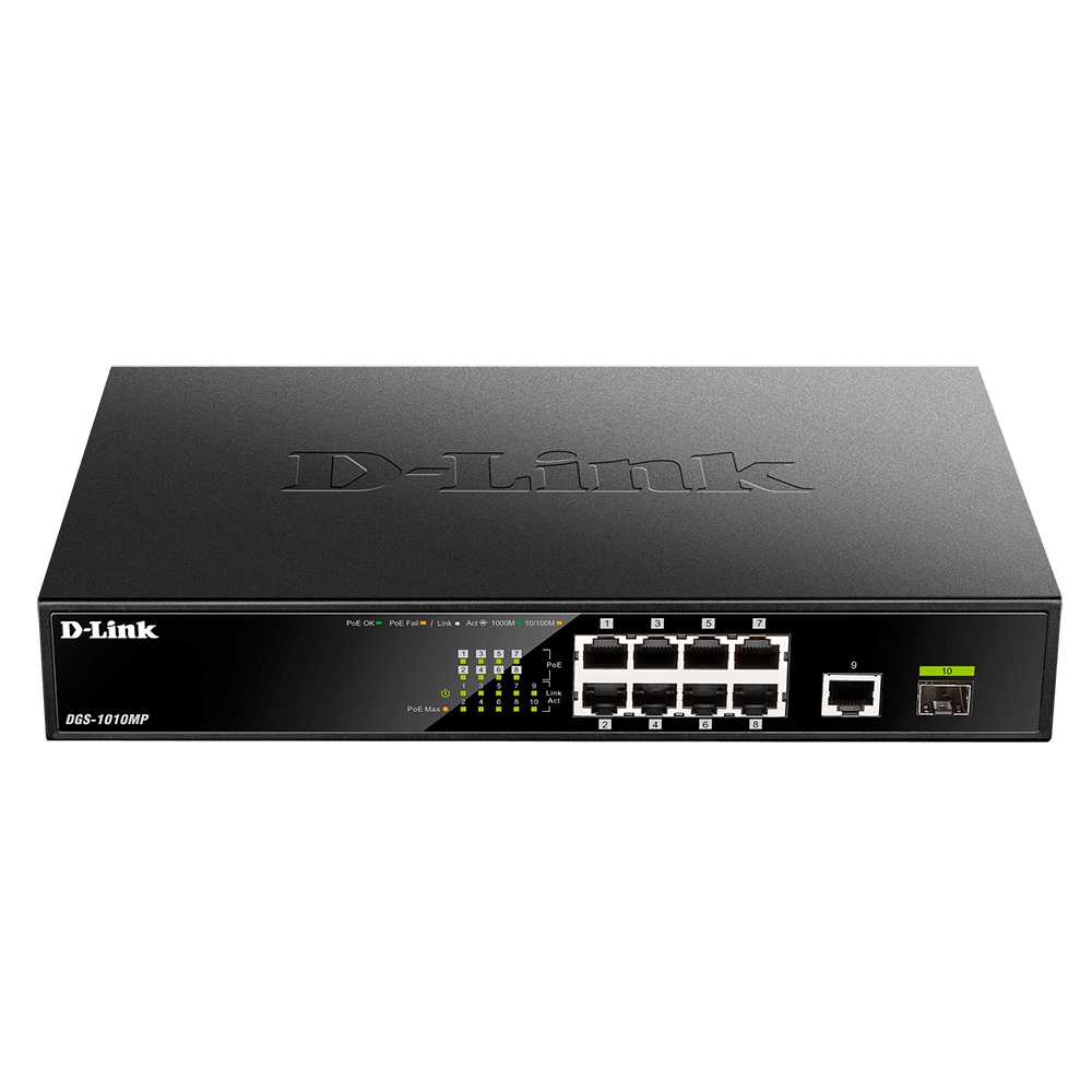The D-Link DGS-1010MP 10-Port Gigabit PoE Switch is an ideal solution for small offices and enterprise environments looking to expand the network with Gigabit connectivity. With eight Power over Ethernet (PoE) ports, you can power more PoE-capable cameras, access points, and VoIP phones using standard Ethernet cabling. And its one Gigabit Ethernet and one SFP uplink port allow for additional connections to storage or an uplink network.