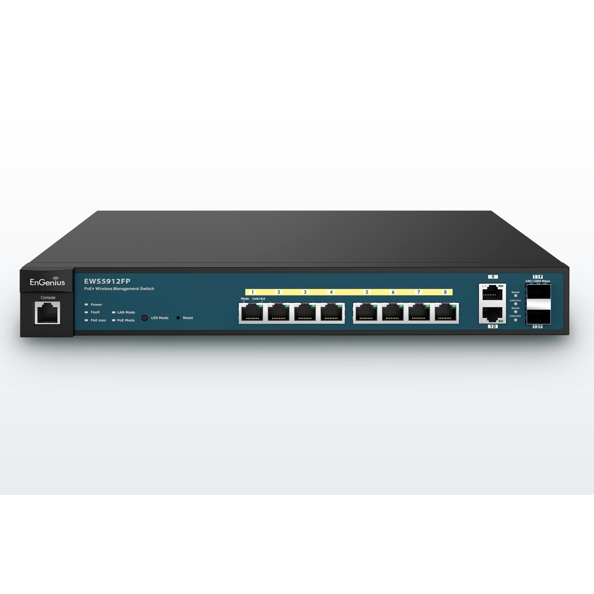 EWS5912FP is a Neutron Series Managed Wireless solution 8-Port Gigabit PoE+ Layer 2 Switch with 2 Gigabit uplink ports and 2 Dual-Speed SFP ports for fiber uplinks. As part of an EnGenius Neutron Series wireless management solution, the EWS5912FP can control up to 20 Neutron Series Wireless Access Points to provide a single location with which to centrally configure and manage the entire network.