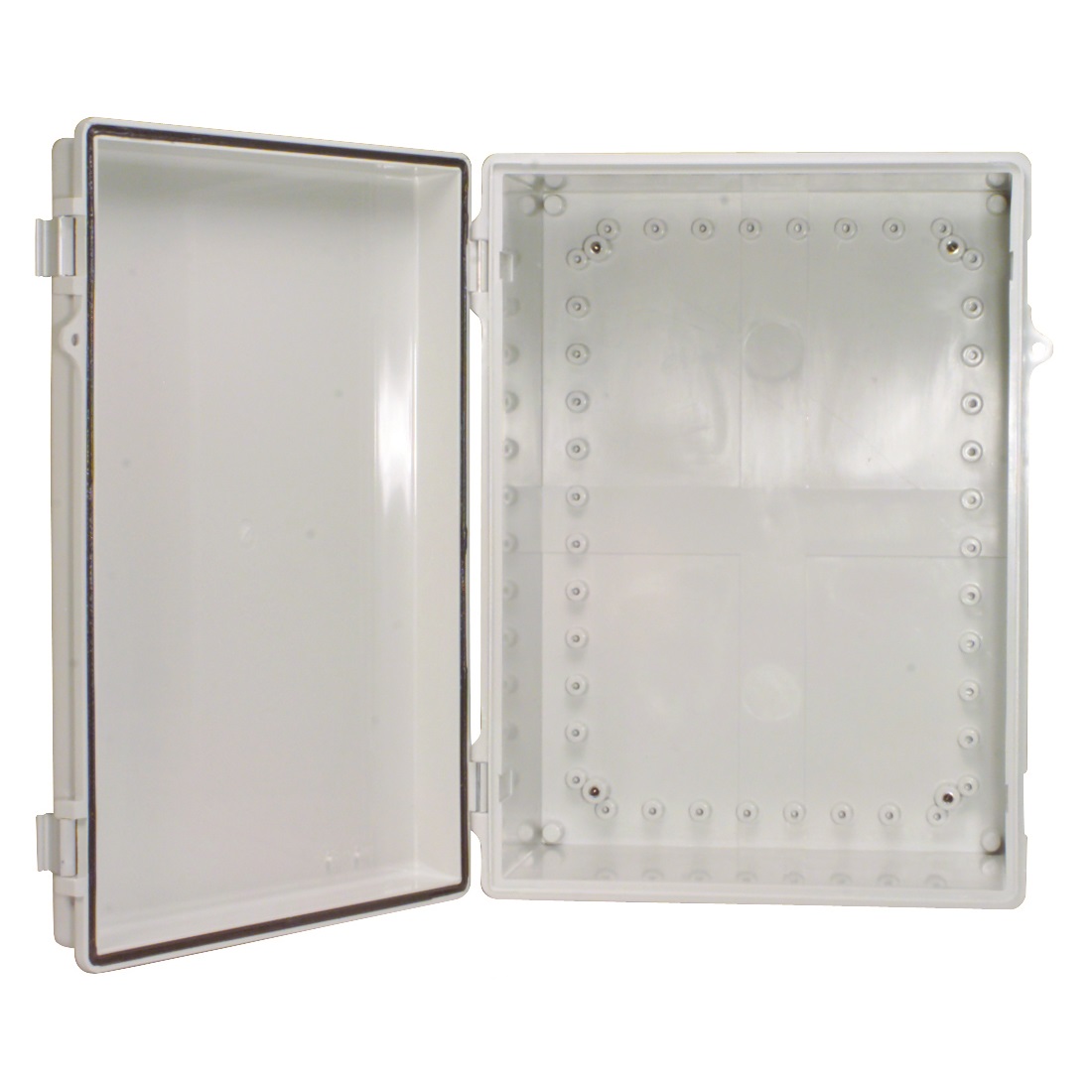 The box is a rugged, lightweight weatherproof economy enclosure that is ideal for both indoor and outdoor applications. Constructed from injection molded ABS resin, it is well suited for a wide range of temperature or harsh environments. The mounting holes are molded into the enclosure permitting it to be wall mounted as well as on a flat surface. The fully gasketed lid features a 2-part molded hinge and molded quick release latches with a locking eye on the lid. Optional Aluminum and Non-Metallic mounting plates are available separately. The enclosure material is UV stabilized and comes in neutral light gray color.